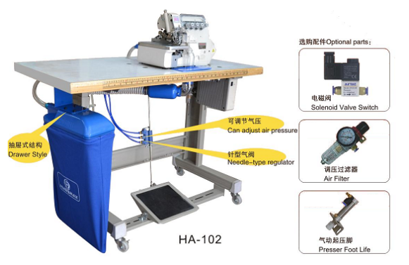 Features:★ Applicable for all brands of overlock, interlock, flat seamer machines. ★ Better environment: strongly suck up cutting waste and fine dust generated during sewing, providing clean & confortable working conditions. ★ Lower cost: save time and labor, keep the machines running well and longer life. ★ Easy to install, auto presser foot lifter (PL devices) can be optionally chosed. ★ This device needs to connect the compressed air supply.
